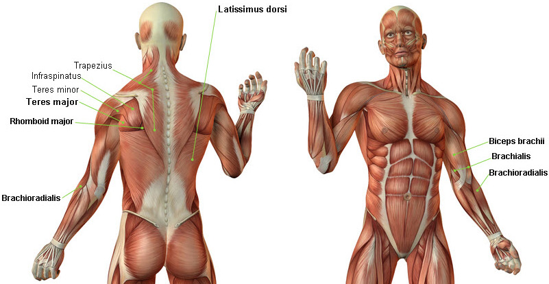 The Single-Arm Row uses many muscles of the upper body, but the main focus is on the latissimus dorsi (lats), teres major and minor, infraspinatus, and low back (if not using a bench for support) and the biceps. Click on image to view it larger.
